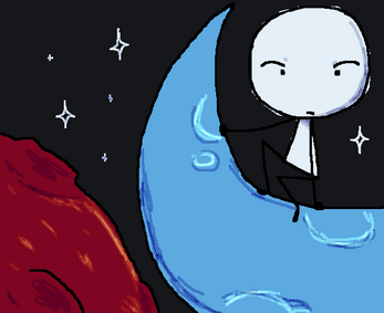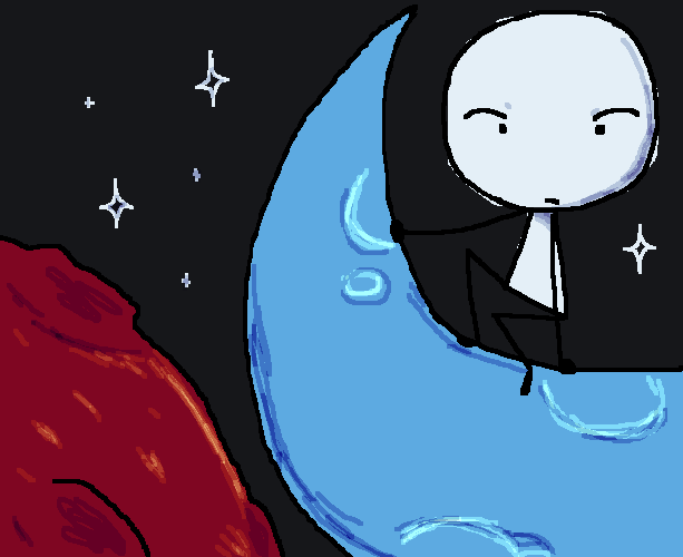 a moon collecting nuclear launch codes from blackholes, once he finishes, goes and finds his sun wife waiting for him.